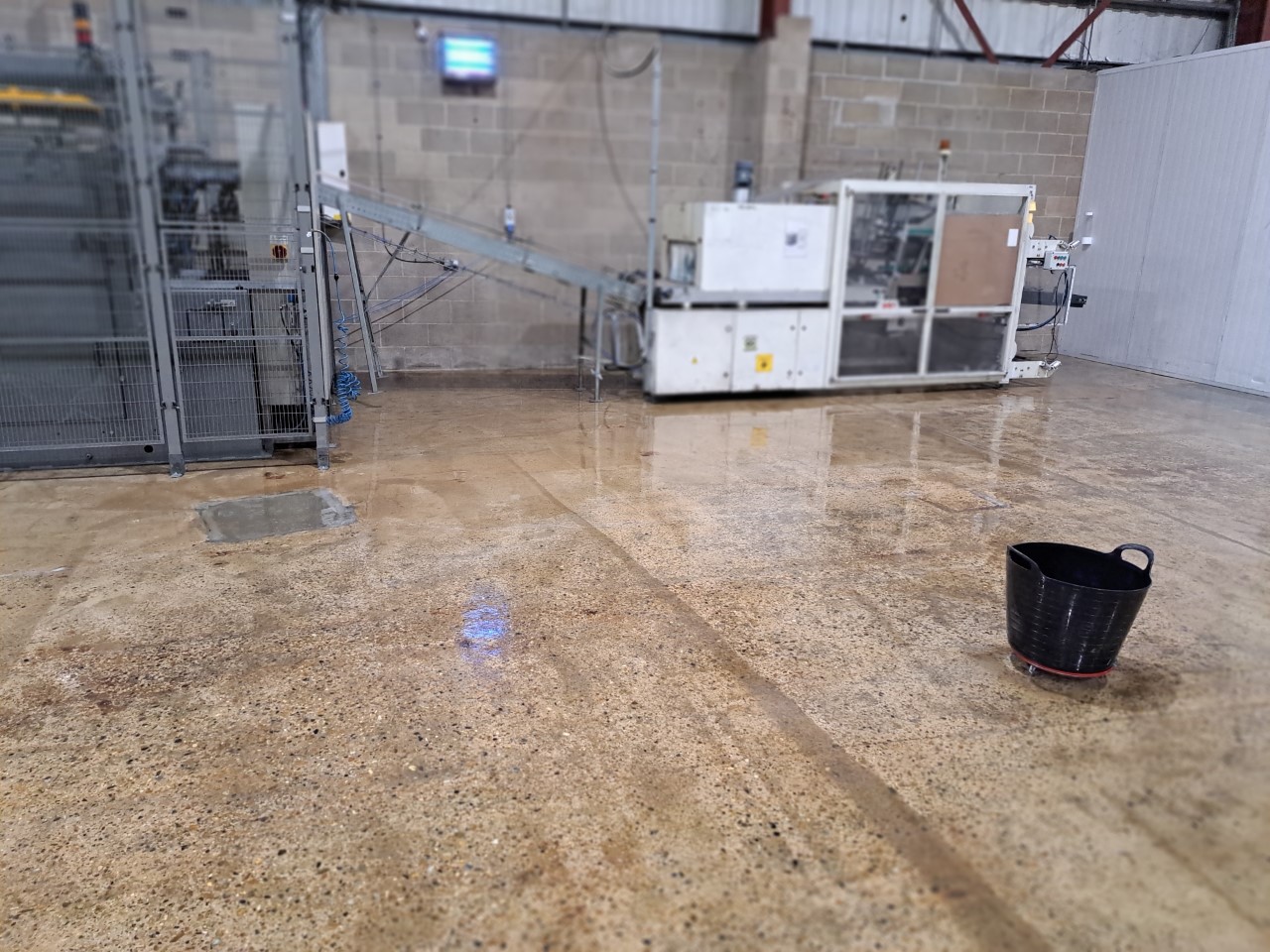 The concrete factory floor in Norfolk was worn and dusting, with exposed aggregates and cracking visible across the surface. As part of the installation of new equipment, a durable and easy to clean epoxy resin flooring system was required to provide a hard-wearing industrial floor finish.